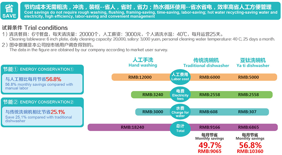 亞鈦洗碗機(jī)性能卓越:(異型餐具通洗,360℃無死角噴洗) ,獨立高溫水箱(確保高溫80℃消菌清洗) ,首創(chuàng)餐具軟壓帶(真正實現(xiàn)餐具零破損),集“粗洗,漂洗,清洗,風(fēng)干”多功能一體,內(nèi)置水循環(huán)系統(tǒng)(保證設(shè)備省電節(jié)水),后端獨立風(fēng)機(jī)(確保餐具零水分),達(dá)到無與倫比的洗滌效果,大大節(jié)約能耗。